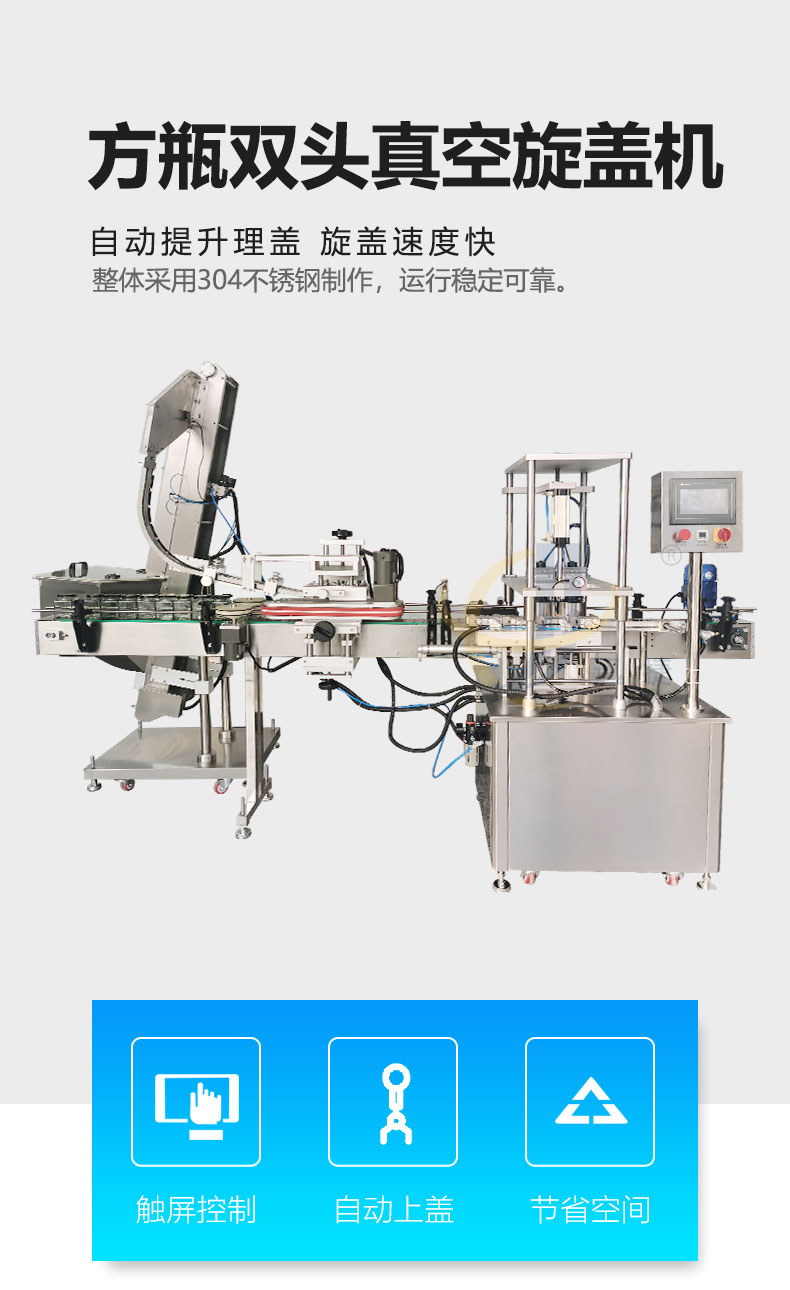 方瓶雙頭真空旋蓋機獨特的設計,可兼容多種不同形狀,尺寸的瓶子旋蓋,兼容性強,且調(diào)整方便;真空壓力可調(diào),觸摸屏人機界面操作簡單方便。