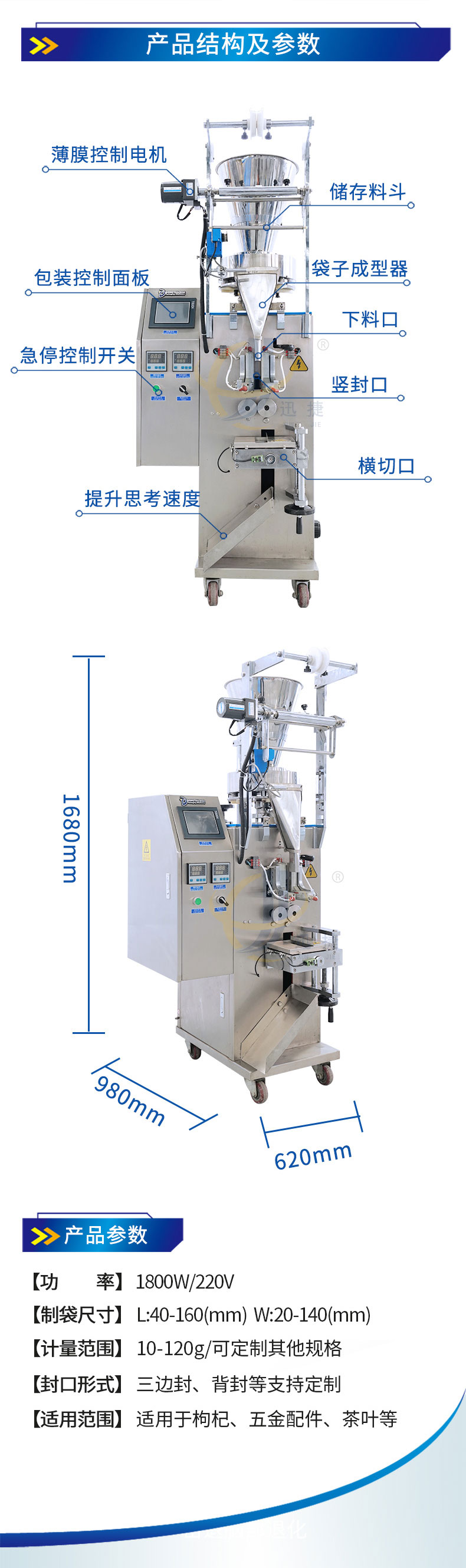 全自動立式顆粒包裝機適用適合食品、化工產品中的圓狀和球狀物料的自動包裝主。枸杞、五金配件、茶葉等包裝。